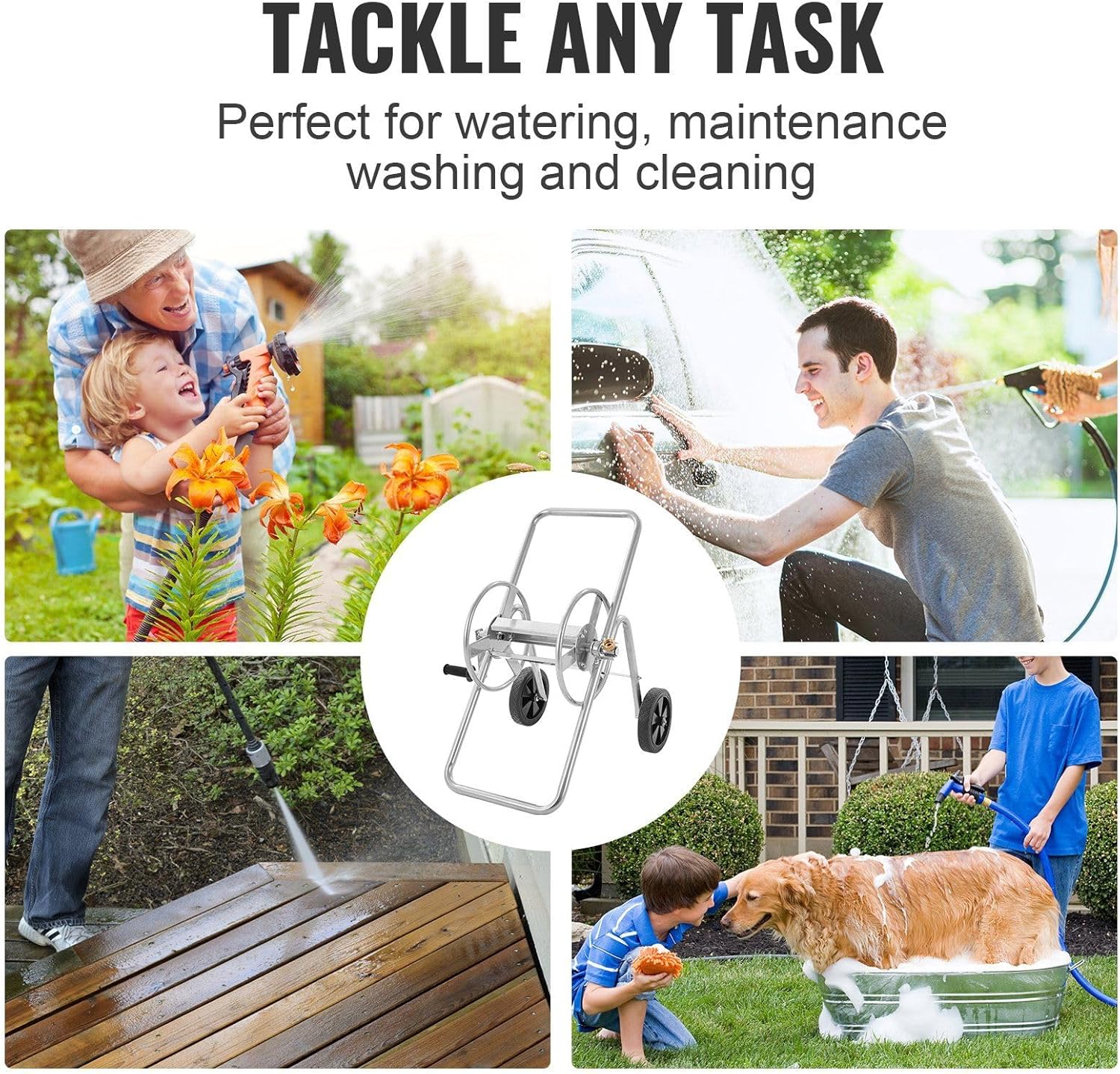 Large Hose Capacity: The hose reel cart can hold up to 175 ft of 5/8'' hose (hose not included), allowing you to reach various corners of your garden, backyard, or other areas without any limitations.Heavy-duty Steel: The hose reel cart has a sturdy steel structure that ensures long-lasting performance. It is equipped with a weather-resistant coating and brass fittings, which make it resistant to rust and leakage. These features ensure that your hose reel cart remains sturdy even in challenging conditions.Effortless Roll-up Hose: The hose cart is equipped with a non-slip handle, making it easy to wind up the hose after use. This feature eliminates the hassle of manually coiling and organizing the hose, saving you time and effort while keeping your hose tangle-free and neatly stored.Stable Mobility: A low center of gravity is beneficial in preventing tipping. The garden hose reel cart is equipped with two solid PVC wheels that are durable and suitable for various terrains. These wheels ensure effortless and smooth movement of the cart, even on rough or uneven ground.Versatile Application: The water hose reel cart is widely used in residential gardens for various purposes such as watering plants, maintaining lawns and grassy areas, irrigation in agriculture and farming, vehicle washing, general cleaning, and other outdoor activities.